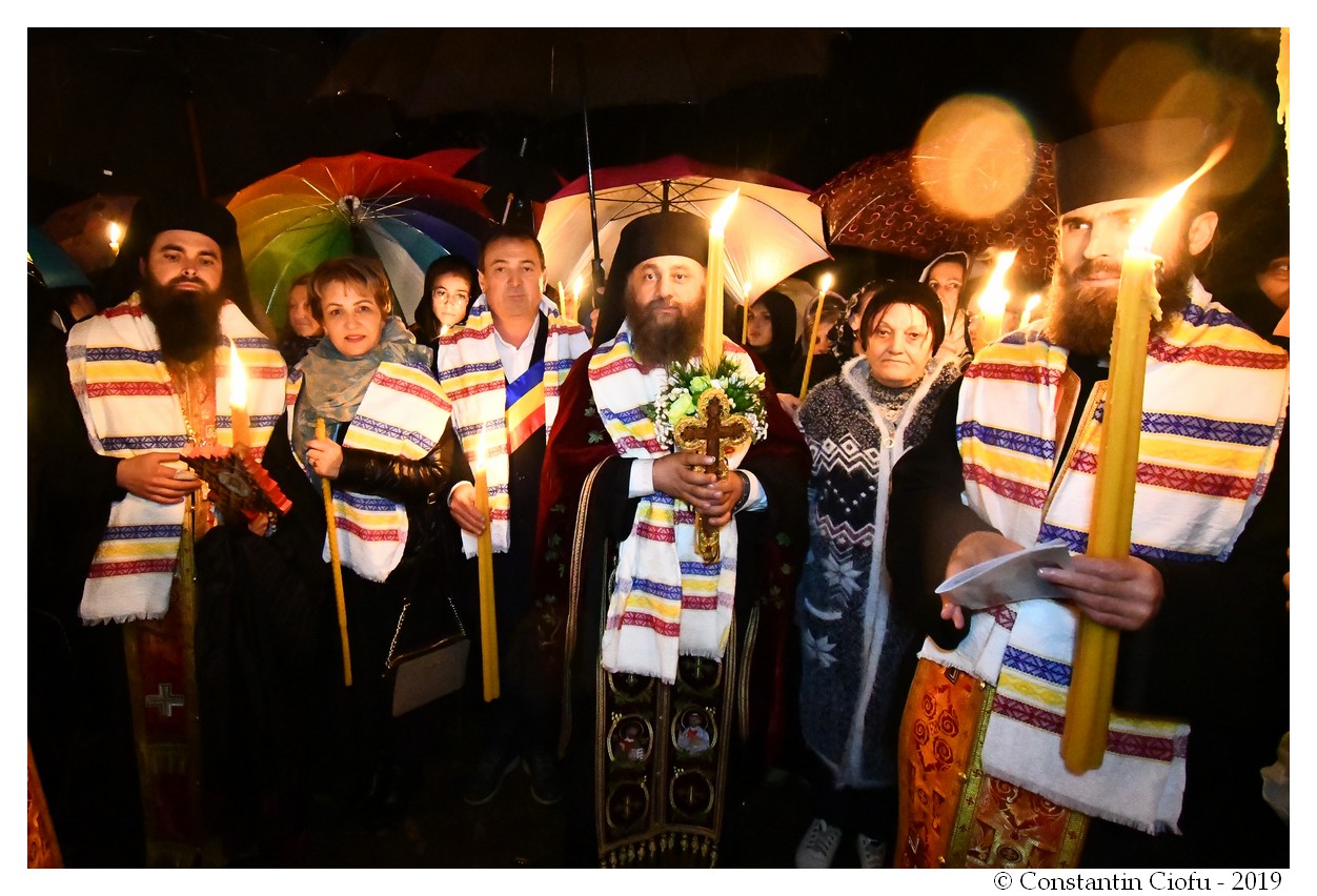 În dangătul clopotelor şi al toacei, pe aleea presărată cu lumânări aprinse, raclele au fost purtate în cadrul procesiunii de fiii duhovniceşti ai Mănăstirii Nechit. Pe parcurs, s-au citit şapte pericope evanghelice şi ectenii. De asemenea, s-au intonat cântări de la slujba de Înviere şi tropare închinate sfinţilor.