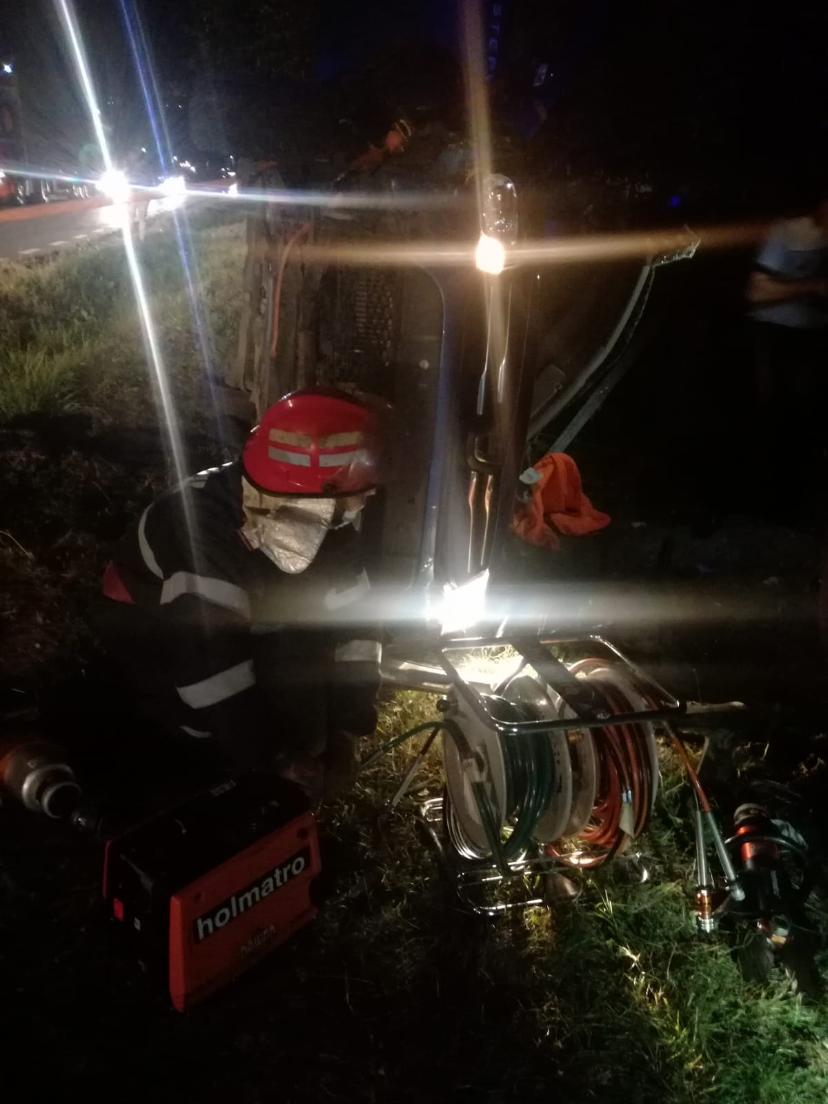 În urma accidentului rutier,  în care un autoturism a părăsit partea carosabilă și s-a răsturnat într-un șanț, au rezultat trei victime blocate în interiorul acestuia.