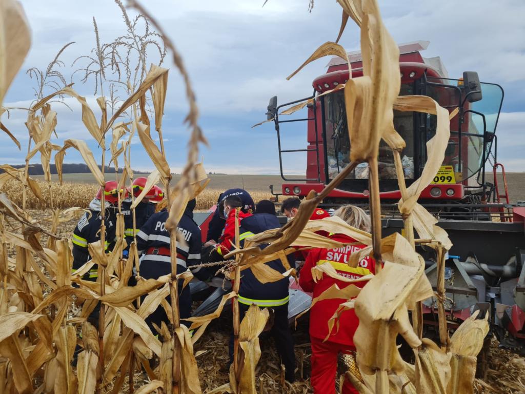 Pompierii au acționat pentru extragerea unui bărbat de 54 de ani, prins într-un heder pentru porumb. Acesta avea membrele inferioare prinse în partea din față a utilajului.