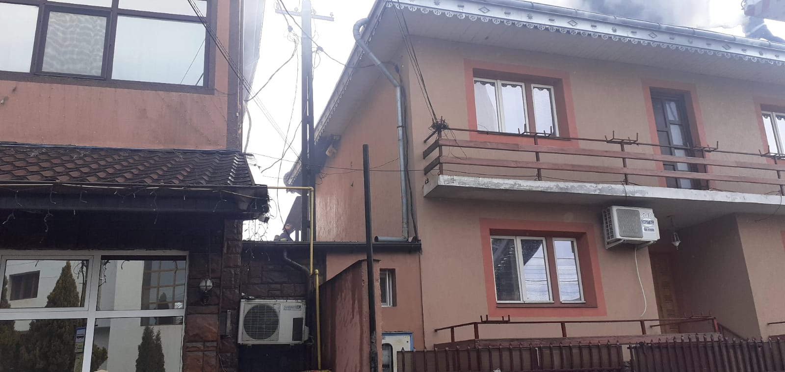 Incendiul se manifesta la acoperișul unei clădiri P+1, cu posibilitatea propagării și la o altă clădire învecinată, o unitate de alimentație publică, situate pe strada Bogdan Dragoș.