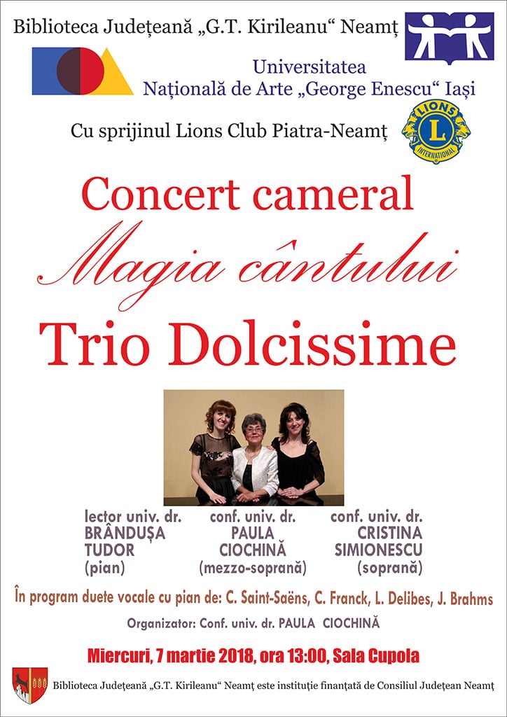 Formația camerală Trio Dolcissime va susține concertul „Magia cântului“ în Sala Cupola a Bibliotecii Județene „G.T. Kirileanu“ Neamț, miercuri, 7 martie 2018, de la ora 13:00. Manifestarea culturală are girul Universității Naționale de Arte „George Enescu“ Iași, este posibilă grație sprijinului acordat de Lions Club Piatra-Neamț și este organizată de conf. univ. dr. Paula Ciochină.