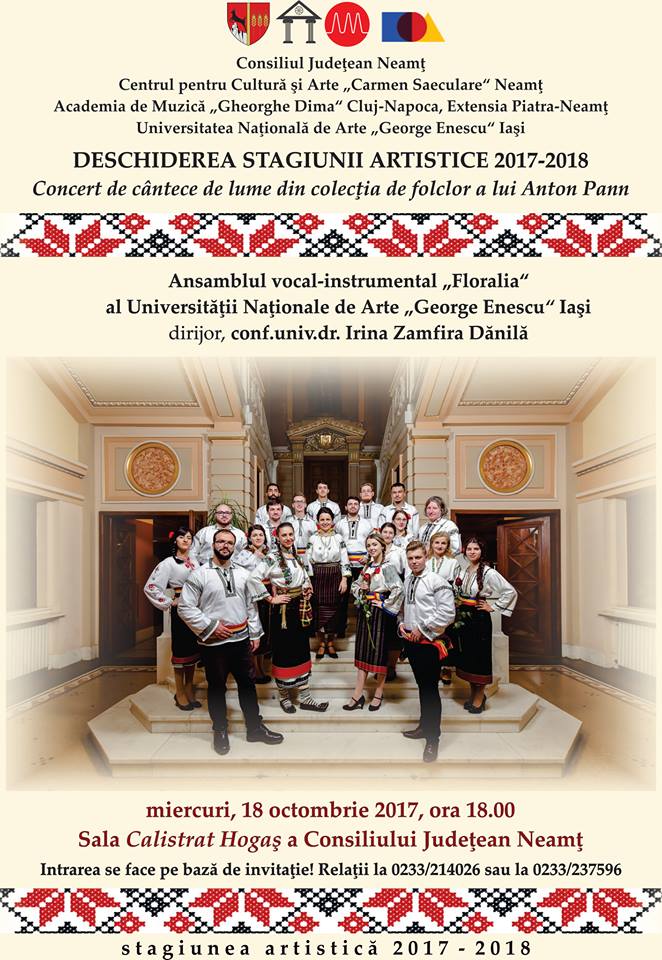 Centrul pentru Cultură și Arte „Carmen Saeculare” Neamț și Academia de Muzică „Gheorghe Dima” Cluj-Napoca – Extensia Piatra-Neamț deschid Stagiunea artistică 2017 – 2018 cu un CONCERT DE CÂNTECE DE LUME din colecția folclorică a lui Anton Pann. Protagonist va fi Ansamblul vocal-instrumental „FLORALIA“ al Universității Naționale de Arte „George Enescu“ Iași, dirijor Irina Zamfira Dănilă.