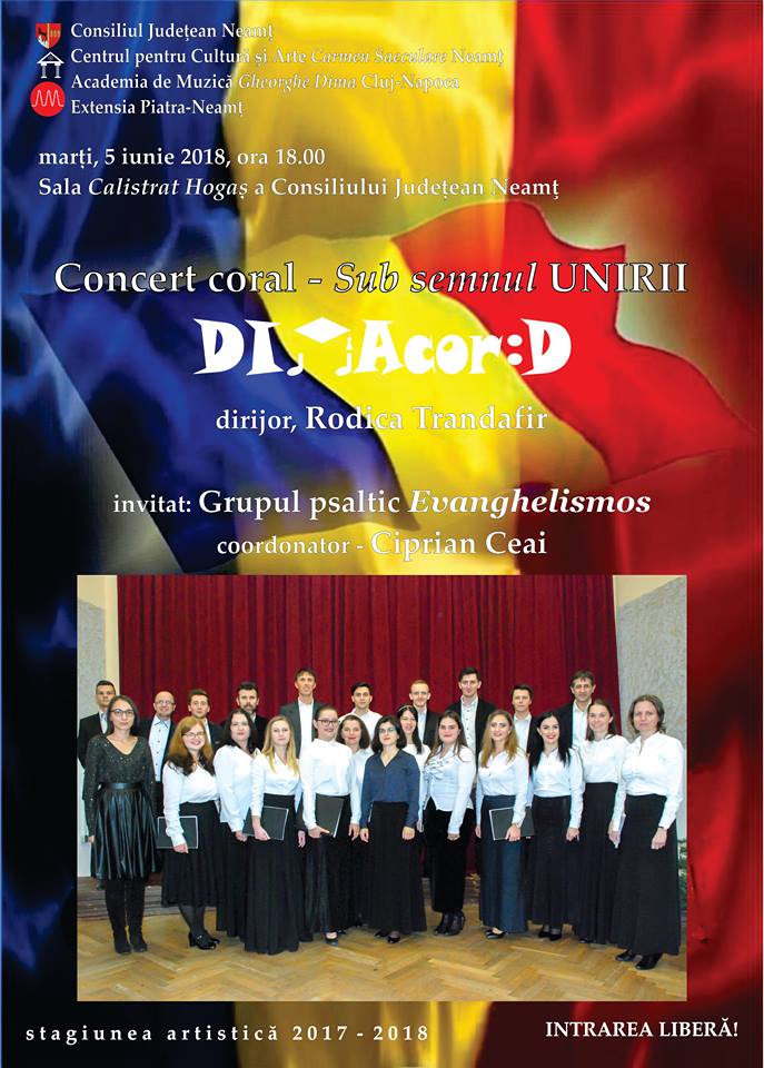 Stagiunea artistică 2017 – 2018, organizată în parteneriat de Centrul pentru Cultură şi Arte „Carmen Saeculare” Neamţ şi Academia de Muzică „Georghe Dima” Cluj-Napoca, Extensia Piatra-Neamţ, propune melomanilor un atractiv concert coral desfăşurat sub semnul Marii Uniri.