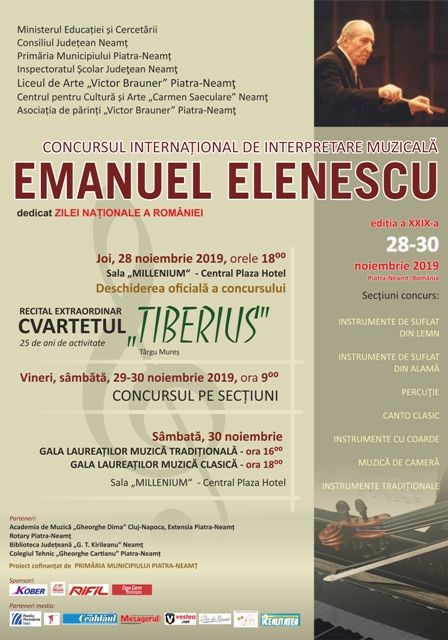 În perioada 28 – 30 noimebrie 2019, Liceul de Artă ”Victor Brauner” Piatra Neamț, în parteneriat cu Inspectoratul Școlar Județean Neamț, Centrul pentru Cultură ”Carmen Saeculare” și cu sprijinul Consiliului Județean Neamț și al Primăriei Municipiului Piatra Neamț organizează cea de-a XXIX-a ediție a Concursului Internațional de Interpretare Muzicală ”Emanuel Elenescu”.