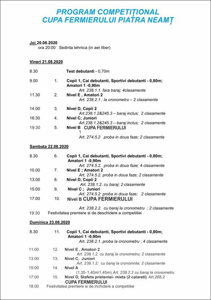 „Această ultimă etapă a celor două competiții naționale s-a desfășurat tot în condițiile impuse de restricțiile pentru Coronavirus, deci tot fără public. Spre bucuria noastră, întrecerile, difuzate on-line, au fost urmărite de mulți iubitori ai sportului ecvestru din întreaga lume și am primit numeroase felicitări pentru organizare și pentru calitatea spectacolului. Mulțumesc, pe această cale Consiliului Județean Neamț, fermierilor și tuturor colaboratorilor“, a declarat Costache Lupu, președintele ACSE Piatra Neamț.