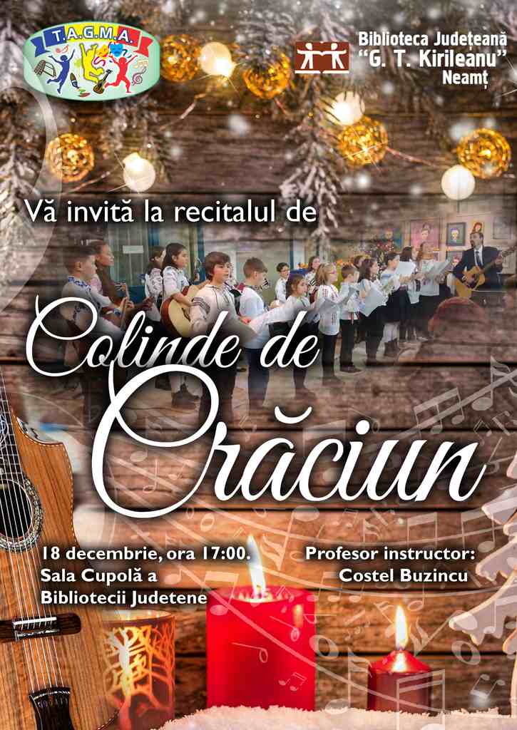 Biblioteca Județeană „G. T. Kirileanu“ Neamț și T.A.G.M.A. vă invită la recitalul de colinde de Crăciun susținut de Asociația „Tinerii de azi, generația de mâine“, profesor instructor Costel Buzincu, în Sala Cupola, miercuri, 18 decembrie 2019, de la ora 17:00.