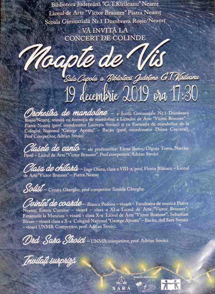 De asemenea, Liceul de Arte „Victor Brauner“ Piatra-Neamț și Școala Gimnazială nr.1 Dumbrava Roșie vă invită la concertul de colinde „Noapte de vis“, care va fi susținut în Sala Cupola a Bibliotecii Județene „G.T. Kirileanu“ Neamț joi,19 decembrie 2019, de la ora 17:30.