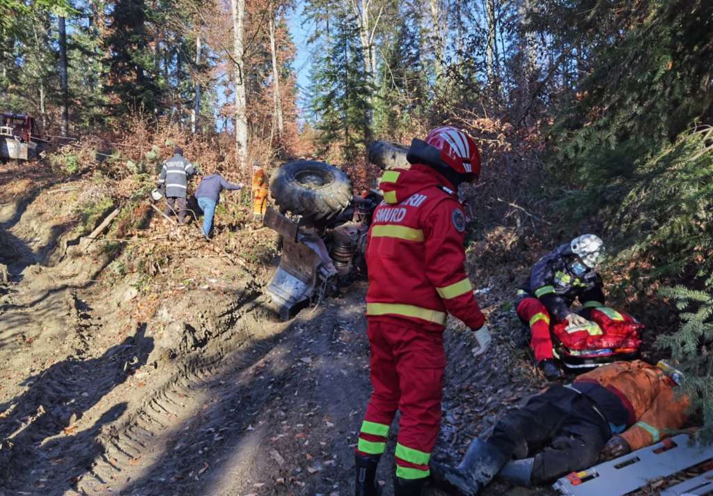 Ajunse la locul producerii evenimentului, forțele de intervenție au constatat că un TAF s-a răsturnat rezultând două victime. O persoană se afla sub utilaj, iar alta în interiorul acestuia.