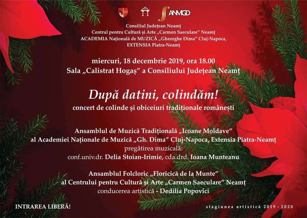 Devenit, de mulţi ani de zile, tradiţie, concertul ”După datini, colindăm!” al ansamblurilor Centrului pentru Cultură şi Arte „Carmen Saeculare” şi Academiei Naţionale de Muzică „Gheorghe Dima” Cluj-Napoca, Extensia Piatra-Neamţ, va avea loc miercuri, 18 decembrie.