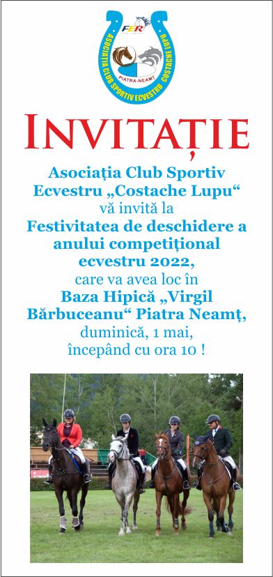 Asociația Club Sportiv Ecvestru „Costache Lupu“ organizează Festivitatea de deschidere oficială a anului competițional ecvestru 2022, care va avea loc în Baza Hipică „Virgil Bărbuceanu“ Piatra Neamț, duminică, 1 mai, începând cu ora 10.
