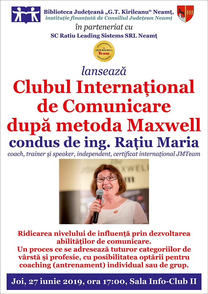 Biblioteca Județeană „G.T. Kirileanu“ Neamț, în parteneriat cu Ratiu Leading Sistems SRL, organizează lansarea Clubului Internațional de Comunicare după metoda Maxwell, condus de ing. Rațiu Maria, coach, trainer și speaker independent, certificat internațional JMTeam, joi, 27 iunie 2019, de la ora 17:00, în Sala Info-Club II. Clubul își propune ridicarea nivelului de influență prin dezvoltarea abilităților de comunicare, proces ce se adresează tuturor categoriilor de vârstă și profesie, cu posibilitatea optării pentru coaching (antrenament) individual sau de grup.