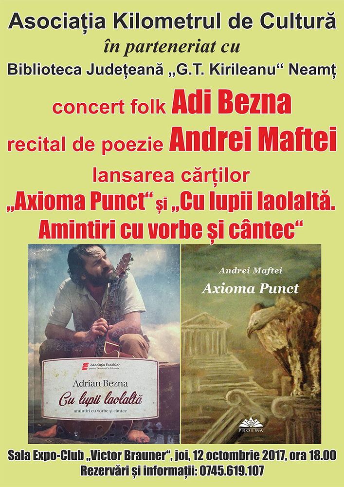 Asociația Kilometrul de Cultură, în parteneriat cu Biblioteca Judeţeană „G.T. Kirileanu“ Neamț organizează o seară de muzică și poezie cu Adrian Bezna și Andrei Maftei. Evenimentul se va desfăşura joi, 12 octombrie, de la ora 18.00, în Sala Expo-Club „Victor Brauner“.