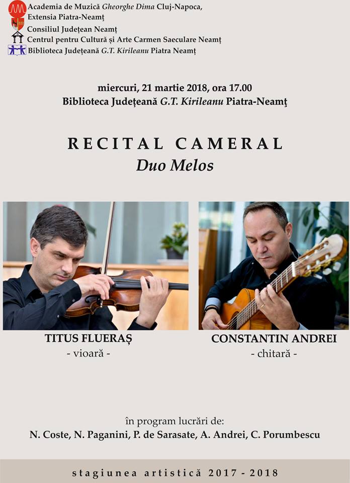 Stagiunea artistică 2017-2018, organizată în parteneriat de Centrul pentru Cultură şi Arte „Carmen Saeculare” şi Academia de Muzică „Gheorghe Dima” Cluj-Napoca, Extensia Piatra-Neamţ, continuă cu un recital extraordinar susţinut de „DUO MELOS”. Titus Flueraş (vioară) şi Constantin Andrei (chitară), cei doi muzicieni ai formaţiei, vor interpreta piese compuse de N. Coste, N. Paganini, P. de Sarasate, A. Andrei, C. Porumbescu.