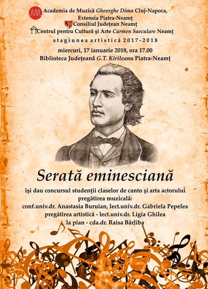 Centrul pentru Cultură şi Arte „Carmen Saeculare” Neamţ, în colaborare cu Academia de Muzică „Gheorghe Dima” Cluj-Napoca, Extensia Piatra-Neamţ, organizează, în cadrul Stagiunii artistice 2017-2018, recitalul muzical intitulat SERATĂ EMINESCIANĂ.