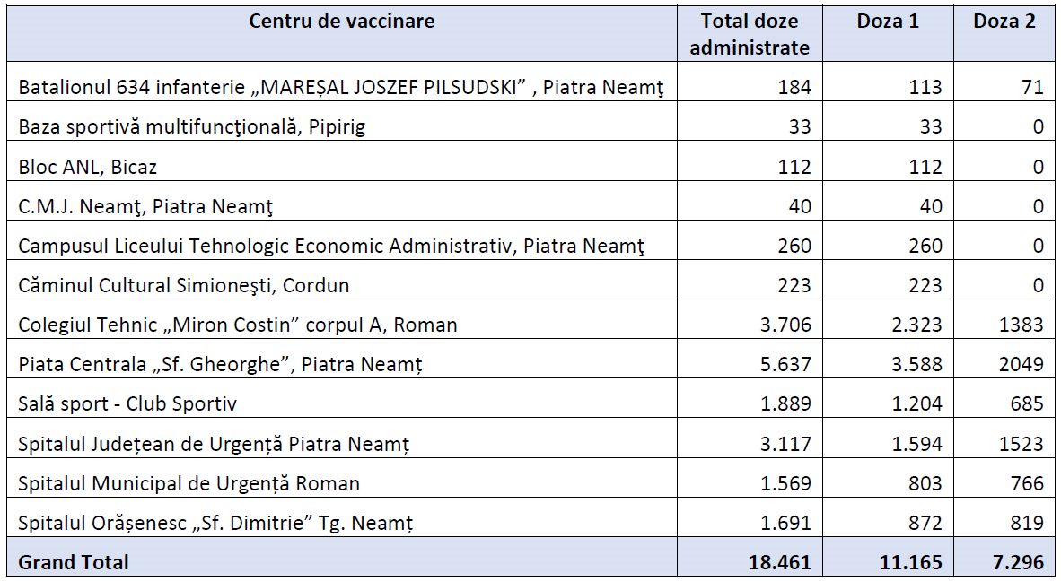 În județul Neamț au fost primite 22.083 de doze de vaccin împotriva covid-19: 18.343 doze Pfizer BioNTech și 1.320 doze Moderna și 2.420 doze AstraZeneca, în 13 tranșe.