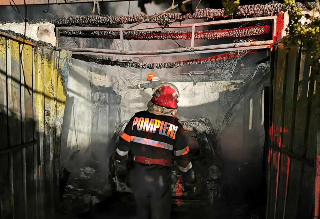 Un autoturism și garajul unde era parcat au ars din cauza unui scurtcircuit electric